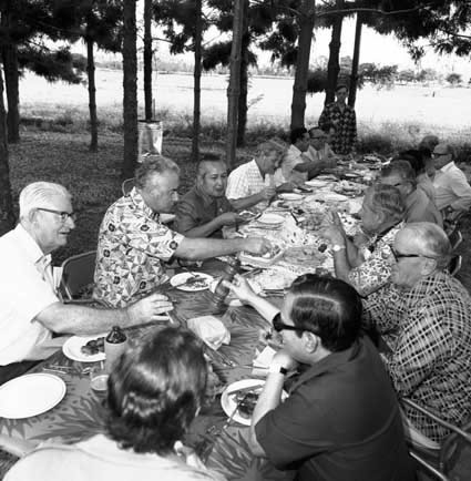 Gough Whitlam and President Soeharto lunching al fresco with Australian and Indonesian officials, Indonesia, April 1975 / NAA: A6180, 11/4/75/105